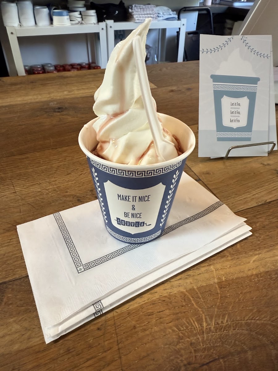 Delicious frozen yogurt with cherry syrup. The tartness of the syrup pairs very well with the creaminess and slight sourness of the yogurt. The pickup window is outside so if are walking your dog, you can order online and pickup without having to go inside. The gentleman working the counter created my frozen yogurt cup upon arrival (I ordered ahead) to make sure it was fresh. Ample places to sit outside.