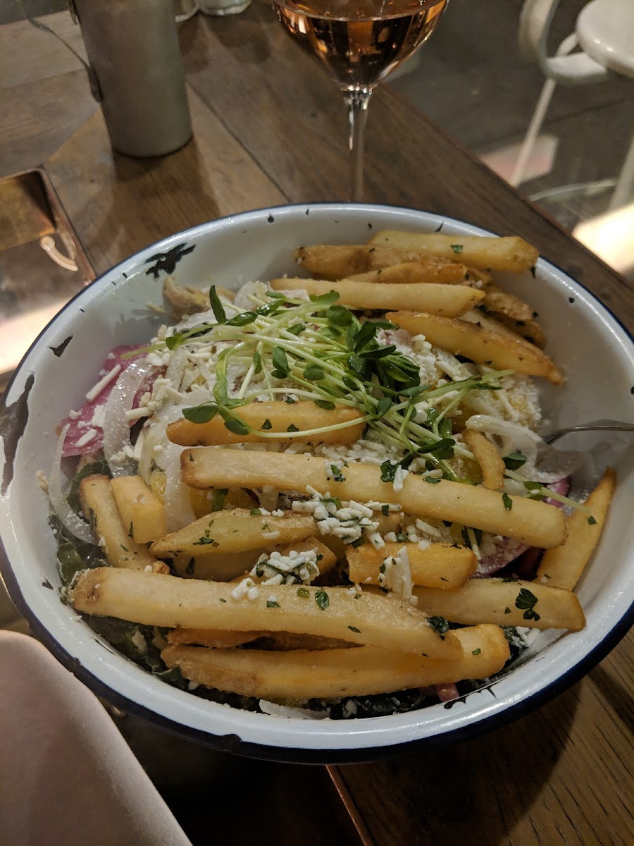 I'm super conflicted! Let me tell you why... The chicken here is some of the best I've ever had!! I would have the chicken salad twice a week for lunch if they had this in Los Angeles near me. The soup was also perfect, exactly the way I love it. I couldn't believe how much the rotisserie chicken flavor came through even in the soup, it was so juicy and tender. Now the pork sandwich and fries were not good at all. The fries were very thick and not crispy, so I felt like I was eating more of a potato wedge, the Greek toppings were not coming through, they just tasted like plain fries. The pork sandwich was very difficult to eat, the bread was so thick and the pork tasted so off, which was weird because the chicken was perfection. So I absolutely loved two dishes, but absolutely hated another two. I would definitely come back when I'm back in sf, but only for the chicken! I had to ding a star due to the pork and fries. I would still recommend everyone to come try the chicken here, it's a great location, and quick and easy for lunch or dinner. I must try the frozen yogurt next time!